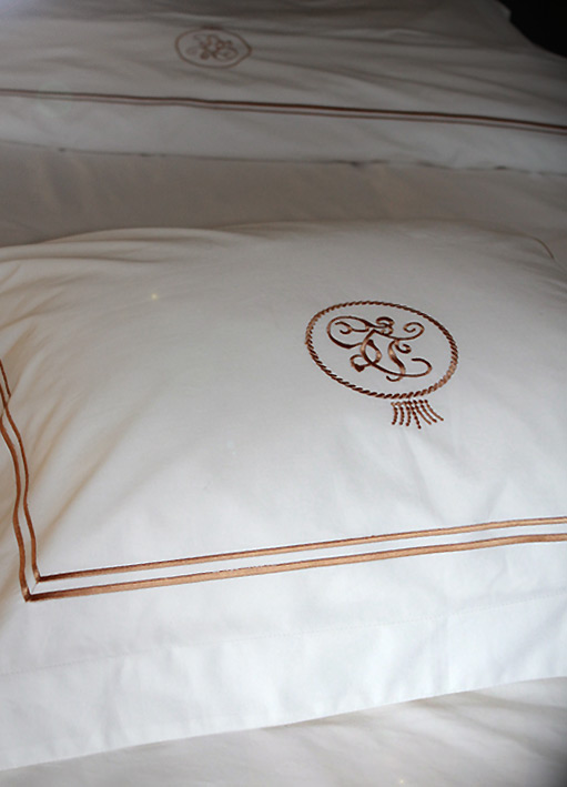 Dekorer på kantsömnad och emblem i en kopparfärgad tråd.
